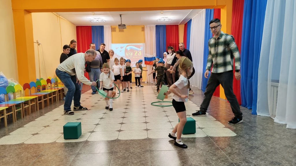 Папы вместе с детьми участвовали в эстафетах "Пограничники", "Донесение", "Помоги товарищу". А также папы показали силу в конкурсе "Силачи".